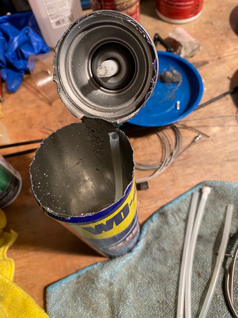 I recycle every scrap of metal in my shop. I go to the scrapyard at least once a year to unload all the rusty chains, broken cantilever brakes from Trek mountain bikes of the 1990’s, broken spokes, bent wheels, bent frames and everything else. I recycle from my kitchen too–all of it goes to the scrapyard, and that includes empty spray cans. Today I found an added bonus to my environmentally conscious endeavors. I found it in an empty can of WD-40.