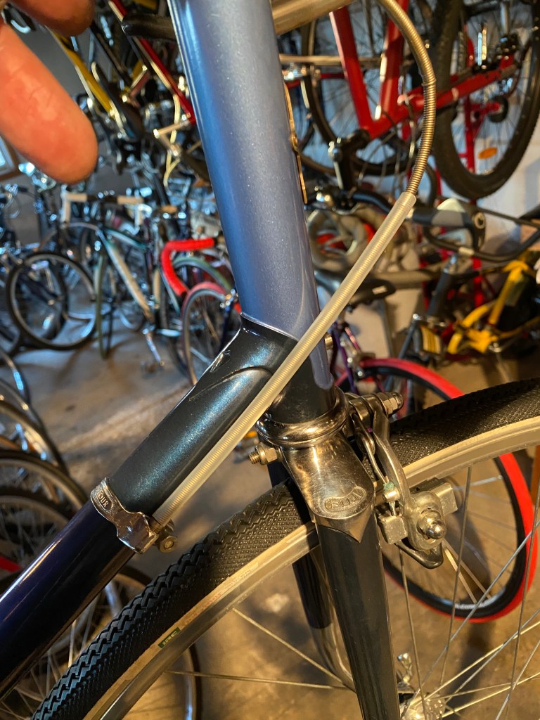 I cut my spray cans in half when they are empty. This assures the guys at the scrapyard that I’m not dropping off anything that will explode. Lately, I’ve been collecting the little tubes inside of the WD-40 cans for an unknown use later on. This week I’ve been hard at work on a 1980 Fuji America. It’s a beautiful vintage model touring bike from the twilight of the Japanese bike boom. It has those coveted Suntour bar-end shifters. These usually go along with an unusual sort of cable housing–a naked steel coil housing, which is itself wrapped in a plastic sleeve where it touches and rubs against the head tube as it leads the shifter cable to the down tube.