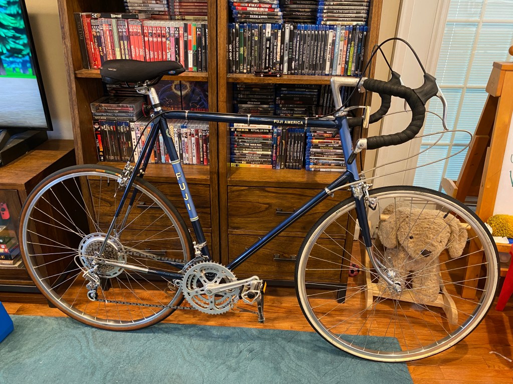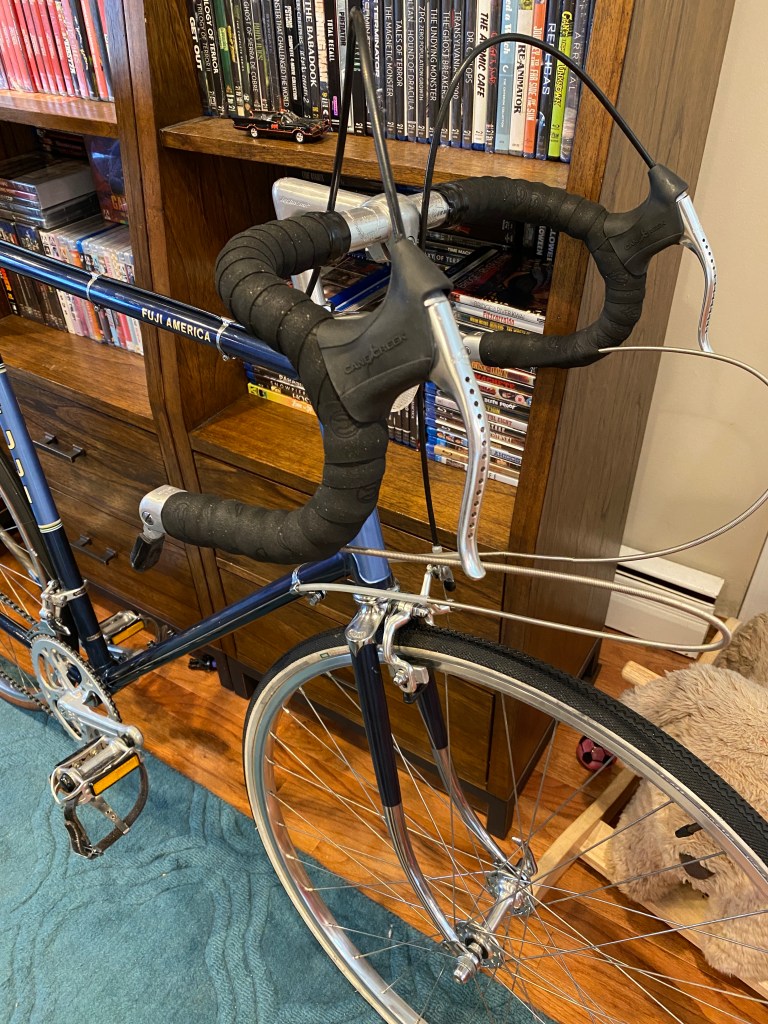 My Fuji America touring bike was missing the plastic sleeves when I purchased it. Someone had wrapped that part of the housing in electric tape. It worked, but it looked bad. I tried to think of something that would replace the lost sleeves that would look better. As I tried out the little straw from the WD-40 can, I thought the inner diameter would be too small, but it turned out perfectly. And lucky for me, I’ve been pack-ratting those little tubes for a while, so I have a matching pair.