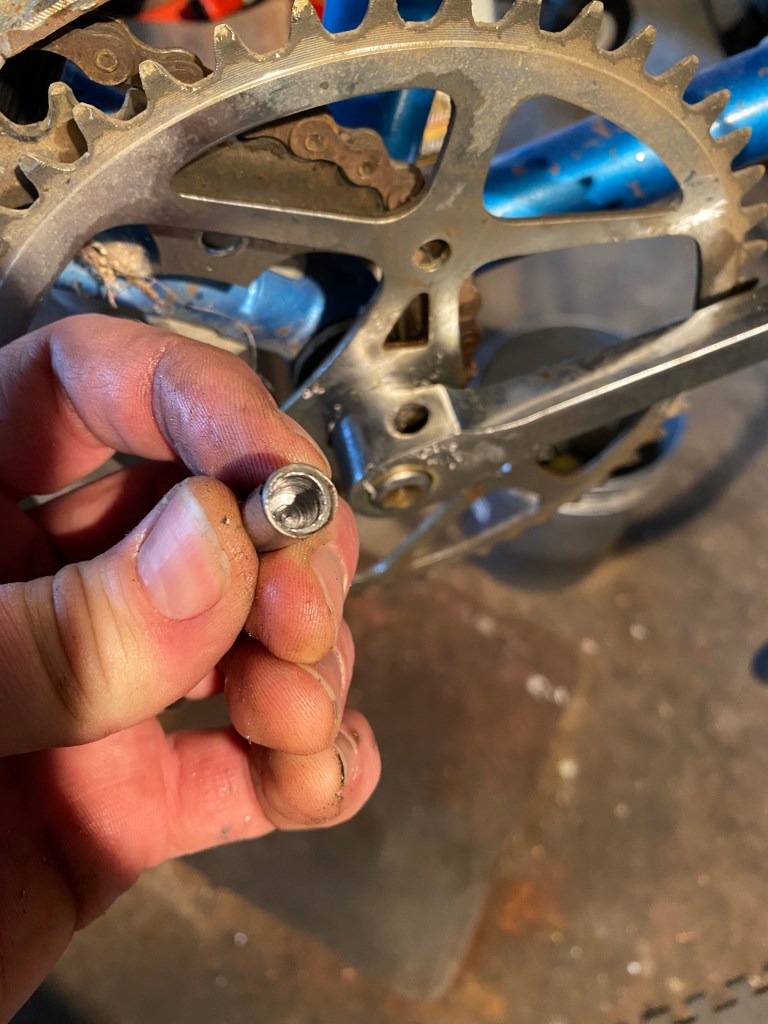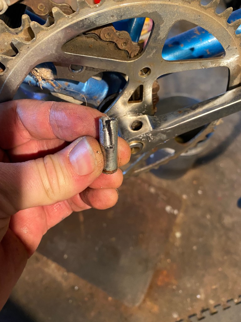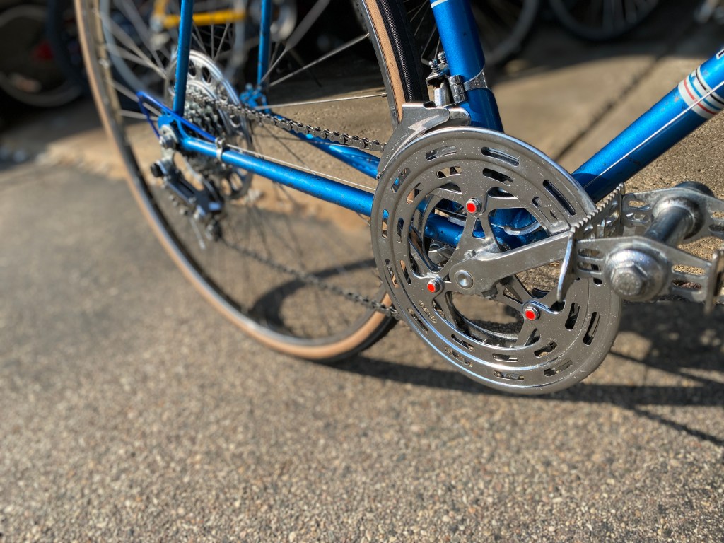 I don’t buy too many bikes with the cranks having the cotter pin as their fastening mechanism. Years of atmospheric moisture and oxidation cause the pins to seize–to almost become the same piece of metal as the crank they’re holding on. Today, after trying heat, soaking overnight in PB Blaster, and many a “tap tap wham!” with the hammer, I had to resort to drilling out the pin. Otherwise, I’m not going to be able to overhaul the bottom bracket. Often times I will replace the whole crankset and bottom bracket set with square taper ones I’ve taken from parts bikes. I sold a yellow Motobecane Mirage last year with a Sugino square-tapered crankset with ‘Fuji” emblazoned on the crank arms. They were black, which looked great on the yellow. I’ll likely not replace this one. It’s in great shape.