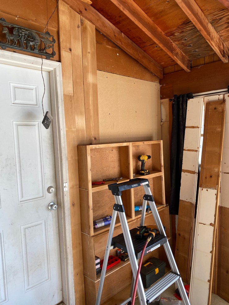 I started with the drawers, and made them into shelves by flipping them upright, stacking them, leveling them, and screwing them to one another and to the studs in the wall. I trimmed them with some of the framing material from the cabinet. Then I had the idea to surround the shelves with the rest of the wood from the tear-out.