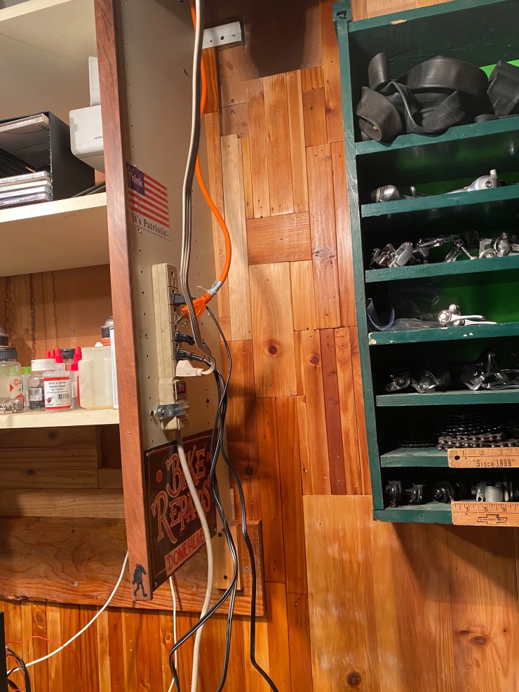 I finished everything with a fresh coat of polyurethane, decorated the shelves with new parts and supplies, and hung a linocut (wood block) print by a local Grand Rapids artist, Alynn Guerra (https://www.redhydrantpress.com).